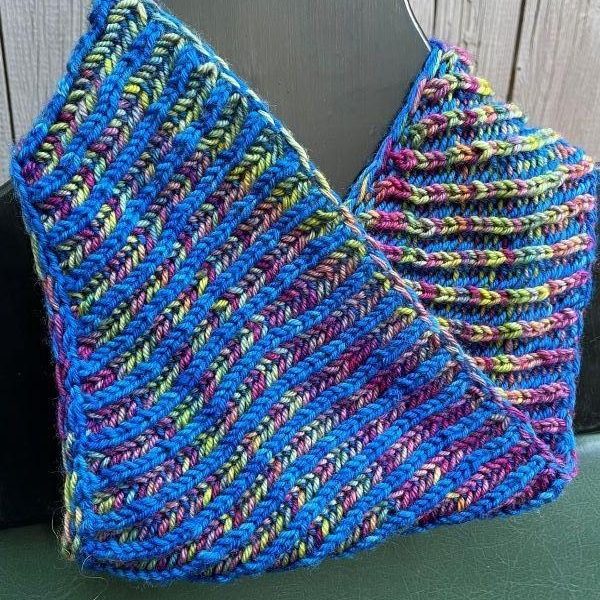 Brioche (lost stitch) Rib in two colors makes a stunning, vertical stripe, reversible cowl that is stretchy and quick. This bandana style cowl (can also be used as a headband) will teach you how to do these vertical stripes in the round and flat. We will only use one color per row so even novice knitters need not fret . The pattern and 100g of wool yarn will be included.