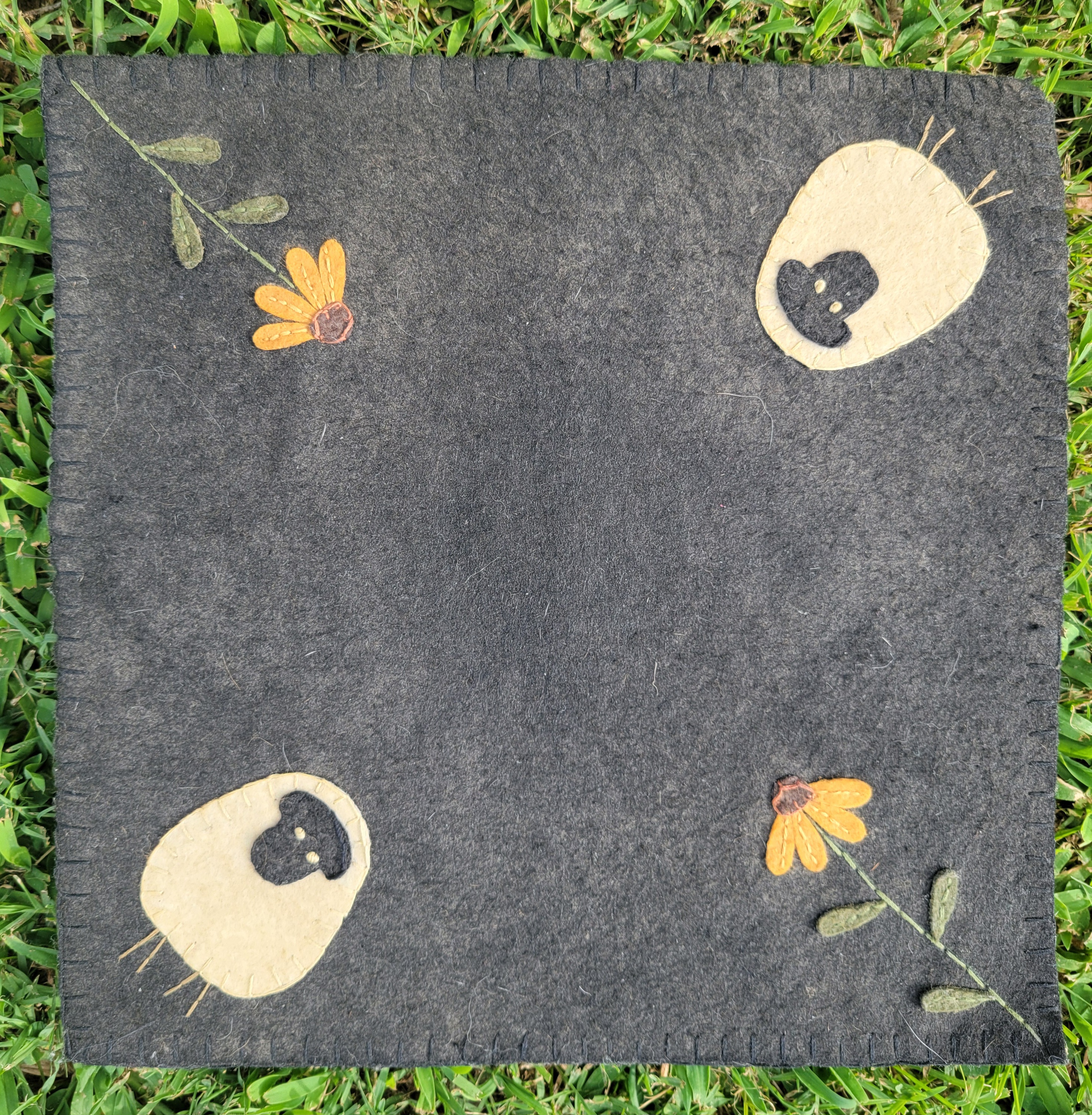 Create sheep and flowers using felt patterns and a couple embroidery stitches. This cute piece will look charming adoring your table or any other special place.