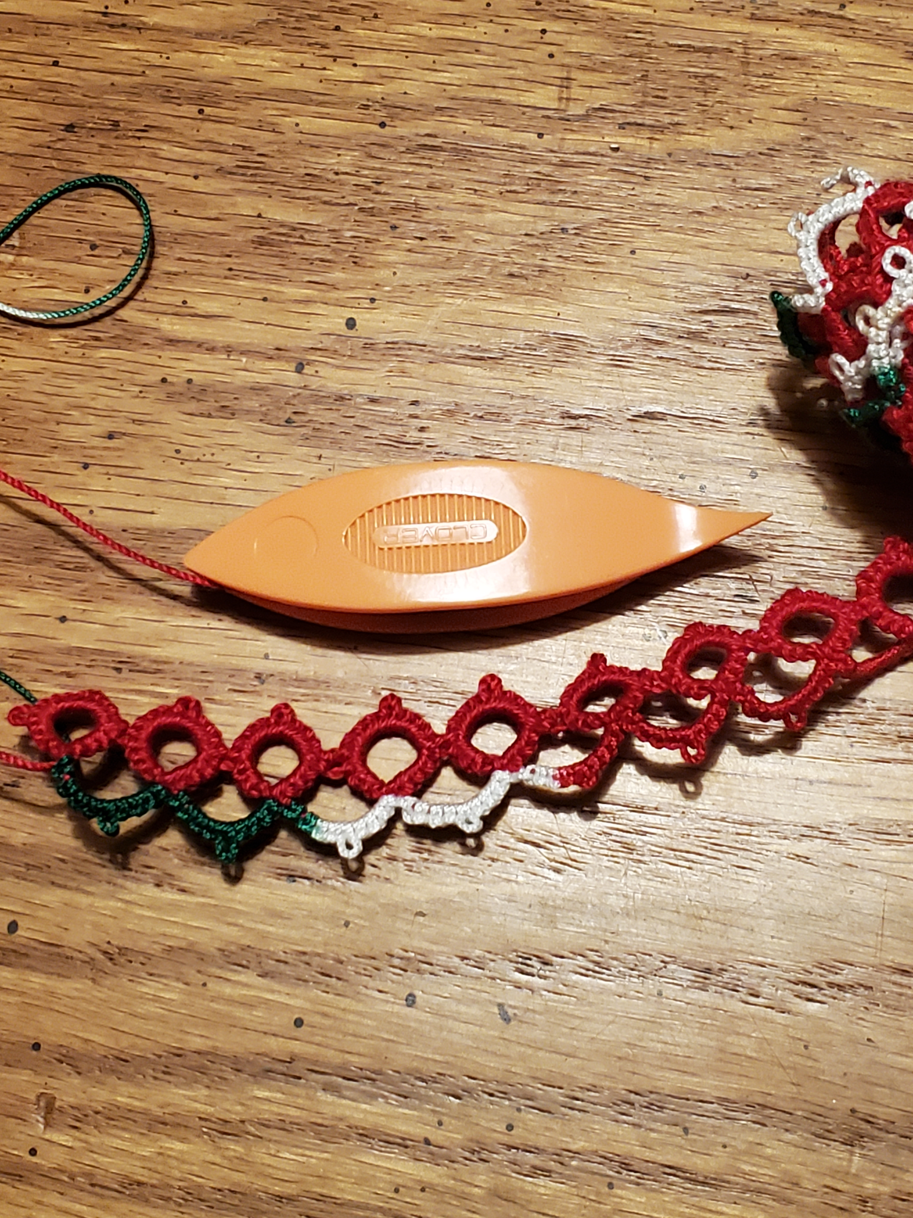 Supplies are included: 1 tatting shuttle and two colors of cotton thread.